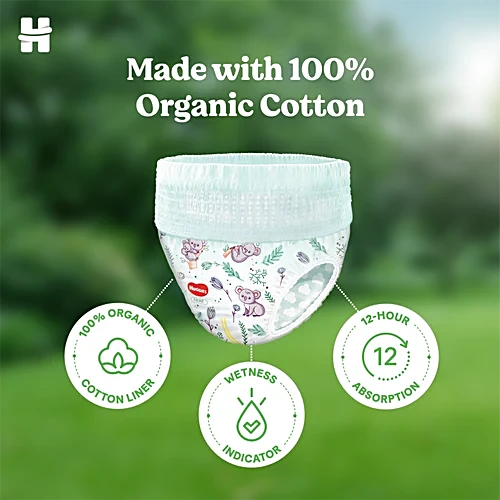 Nature's gentle protection for your baby's delicate skin. Presenting the new Huggies Nature Care Diaper Pants. Made with organic cotton and a pH balanced liner, it's the ideal pant-style diaper for your little one's delicate skin. With no added parabens, latex & chlorine it gently protects your baby's skin. It's more than a diaper pant, it's a hug from Nature. Made with organic cotton and a pH balanced liner with no added parabens, latex & chlorine with the wetness indicator.