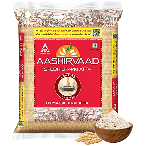 About the product Aashirvaad Atta is a premium wheat flour made from carefully selected, high-quality grains that are known for their exceptional quality. The grains are heavy, golden amber in colour, and have a satisfying bite. Aashirvaad Atta is meticulously ground using a modern chakki process, ensuring the perfect balance of colour, taste, and nutrition. Containing pure wheat and 0% maida, this atta absorbs more water, resulting in softer, fluffier rotis that remain fresh for longer. Trusted by Indian farmers, Aashirvaad Atta goes through a rigorous 10-step process to ensure Zero human contact, delivering a pure, healthy, and delicious experience with every bite. Crafted with care by Aashirvaad experts and Indian farmers, this premium atta is the number one branded atta in the country, offering superior quality and unparalleled nutrition in every pack.