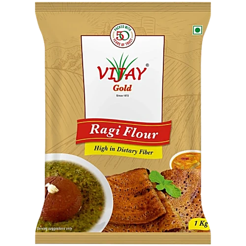 Vijay Gold Ragi Flour is a premium quality finger millet flour that is a true superfood. Sourced from the finest ragi grains across India, this nutrient-dense flour is rich in protein, fibre, vitamins, and minerals, making it an excellent choice for boosting your overall health and well-being. With its low-fat content and easy digestibility, this versatile flour can be used to prepare a variety of traditional dishes such as porridge, rotis, dosa, and puttu, adding a delightful flavour and a wealth of essential nutrients to your daily diet. Enjoy the benefits of this ancient South Indian staple in a convenient and hygienically processed form, with no cholesterol or trans fats. Vijay Gold Ragi Flour is the perfect addition to your pantry, elevating your culinary creations while nourishing your body.