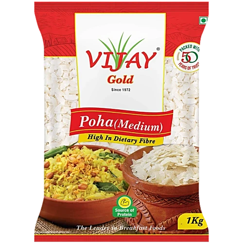 Vijay Medium Poha is a premium quality flattened rice that is perfect for creating a wide variety of delicious snacks and light meals. Made from carefully selected organic rice that undergoes a rigorous 4-step cleaning process, this poha offers a delightful balance of thickness and texture. The flakes range from almost translucently thin to nearly four times thinner than a normal rice grain, providing the ideal consistency for your dishes. Poha is a versatile ingredient used in many Indian cuisines, making it a popular choice for breakfast, brunch, or as a light and easy fast food option. Packed with carbohydrates, iron, fibre, antioxidants and essential vitamins, this gluten-free poha is a healthy and flavourful staple that can be easily customised to suit any taste preference. Enjoy the classic light and tasty experience of this beloved Indian breakfast favourite.