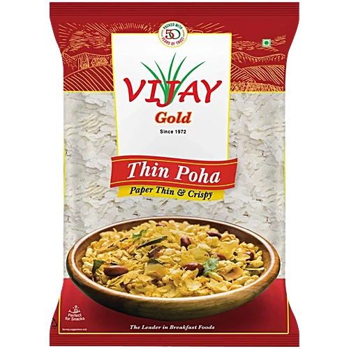 Vijay Thin Poha is made from carefully selected rice that is parboiled, flattened, and dried into paper-thin, crispy flakes. Light and versatile, it is perfect for preparing a variety of traditional dishes, from savoury snacks to delicious breakfast meals. Enjoy its delicate texture and authentic taste in every bite. A wholesome choice for your kitchen!