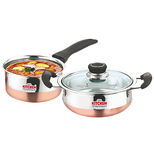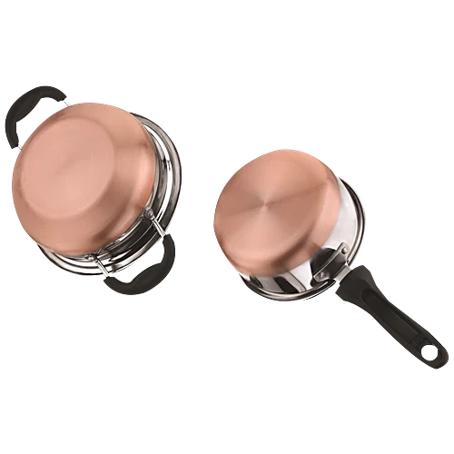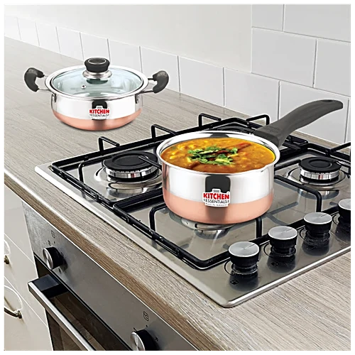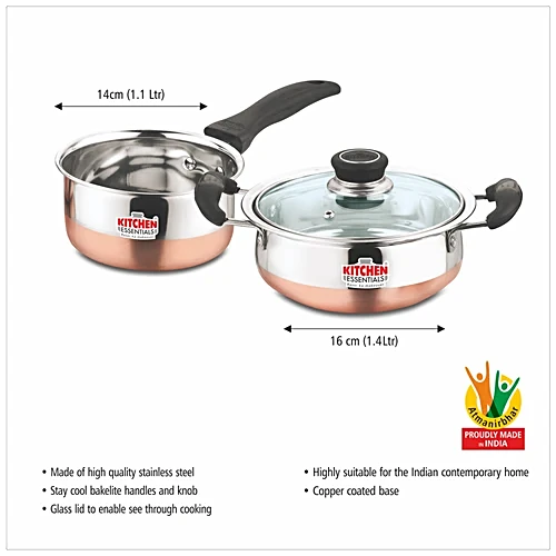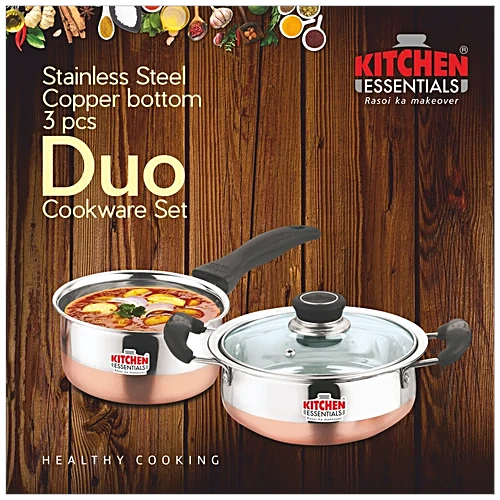 This classy copper bottom cookware set is not only attractive to look but also very handy. Now you do not have to struggle to get other utensils in hand after it is cooked since the food can be served straight into the same. The saucepan is very useful and is easy to use. The copper bottom of the set gives it an elegant Indian look.