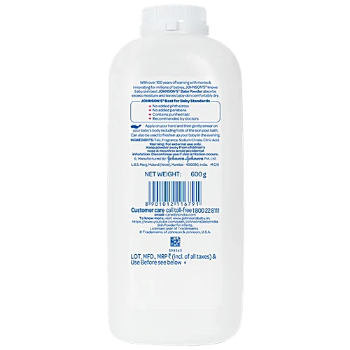 Johnson's baby powder absorbs excess moisture and keeps baby's skin comfortable and dry. Johnson's baby powder is dermatologist tested and hypoallergenic. U.S. Pharmacopoeia grade talc to ensure it meets the highest quality and purity. Highest IFRA fragrance standard. No Parabens, No Sulfates, No Dye. Recommended by doctors. Johnson's baby powder formula awakens and stimulates your baby's senses making your baby feel fresh and play happily with everyone.