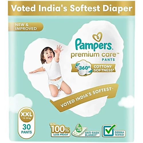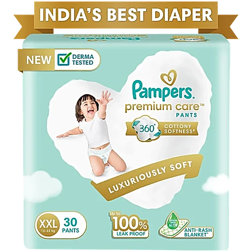 New Pampers Premium Care Pants with 360-degree cottony softness give your baby the ultimate comfort all day and all night long. Pampers Premium Care Pants contain soothing lotion with aloe vera to protect your baby's skin from rashes, while its 10 million micropores allow your baby's skin to breathe. Its 12-hour leak lock facility keeps your baby dry and away from wetness. Experience 5-star comfort with unique added features like a wetness indicator that turns yellow to blue, indicating when you may change the diaper, and a disposal tape to help you with easy disposal. Pampers Premium Pants are available in the newborn (NB), S, M, L, XL, and XXL sizes.